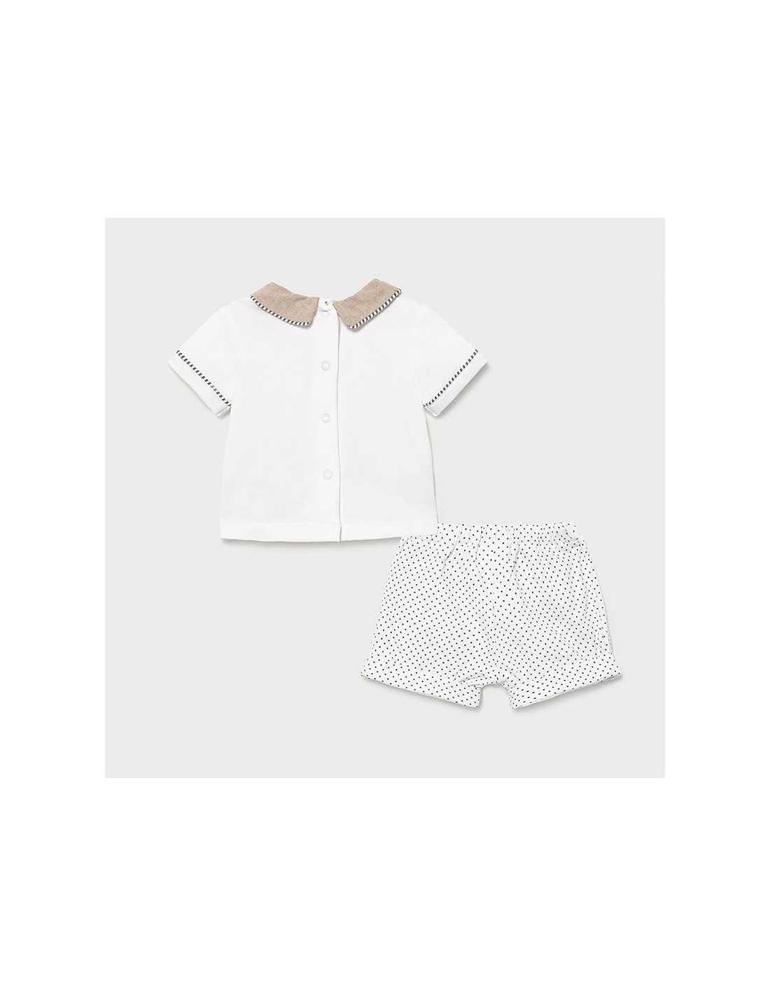 Pantalón de tipo bermuda para recién nacido niño. Cierre con botones a presión. Goma elástica en la cintura para un mejor ajuste. Estampado de lunares.