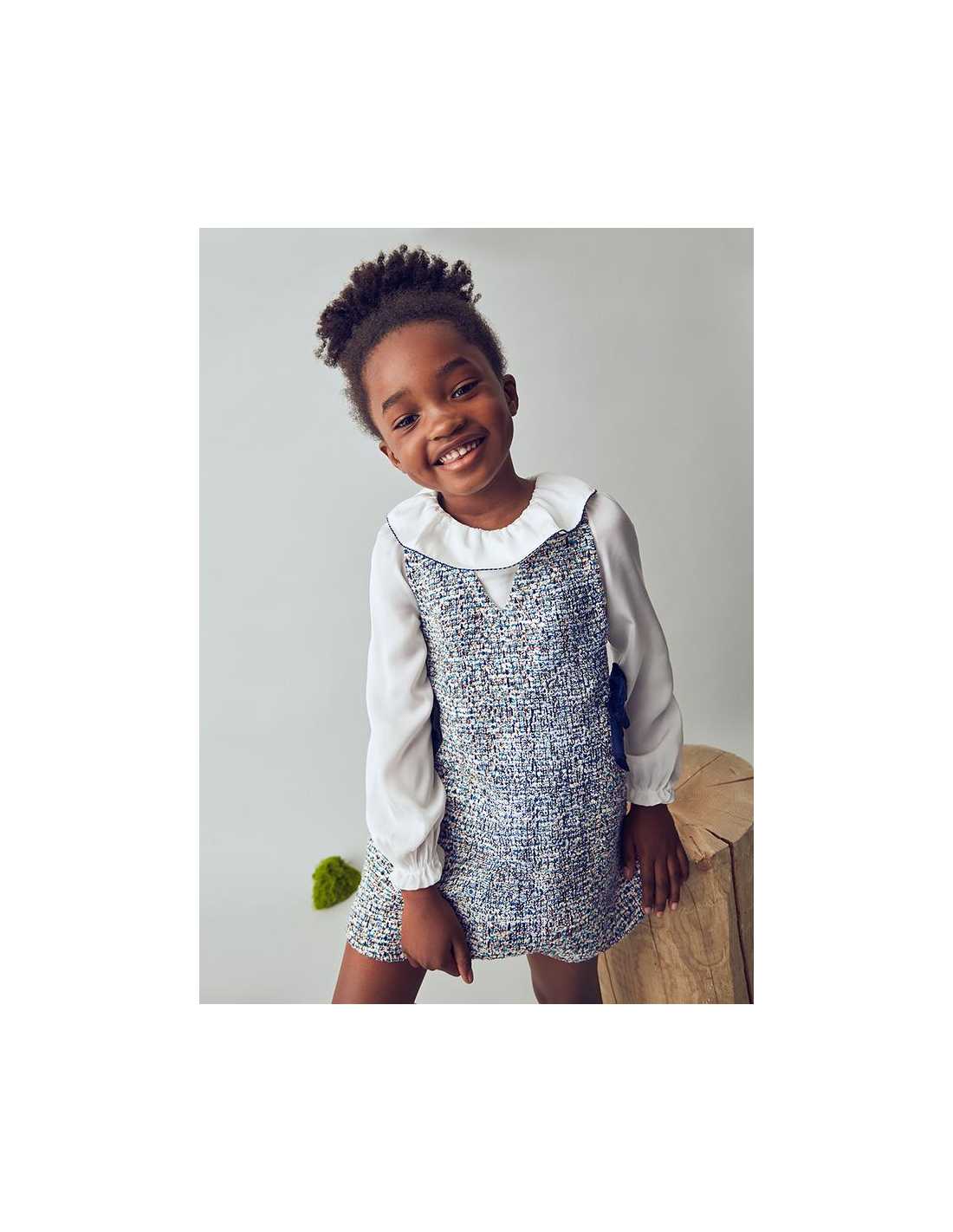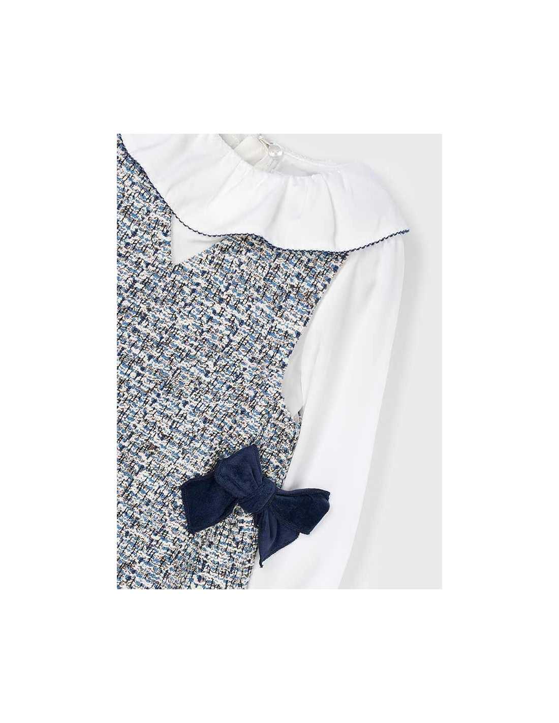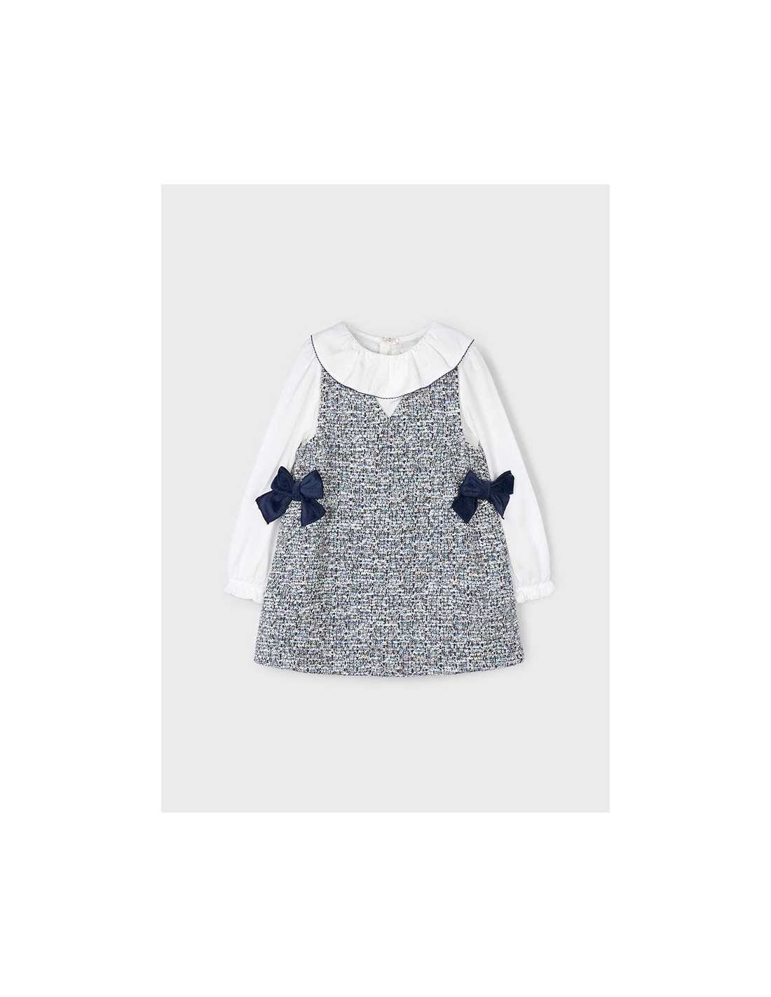 Vestido de manga larga para niña con puños elásticos en el interior. Cuello bebé. Cierre con cremallera en la parte trasera para una puesta ágil y rápida. Confección combinada en distintos tejidos para conseguir un diseño único y especial. Modelo con forro interior. apliques de lazos de terciopelo.