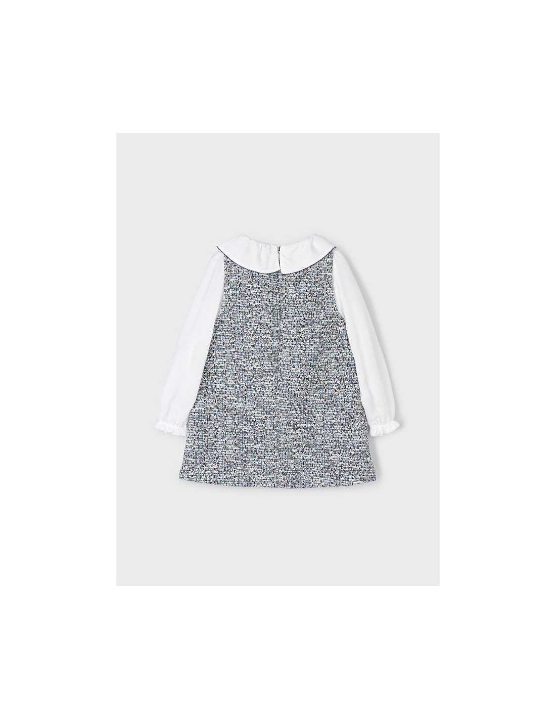 Vestido de manga larga para niña con puños elásticos en el interior. Cuello bebé. Cierre con cremallera en la parte trasera para una puesta ágil y rápida. Confección combinada en distintos tejidos para conseguir un diseño único y especial. Modelo con forro interior. Elementos de adorno: apliques de lazos de terciopelo.