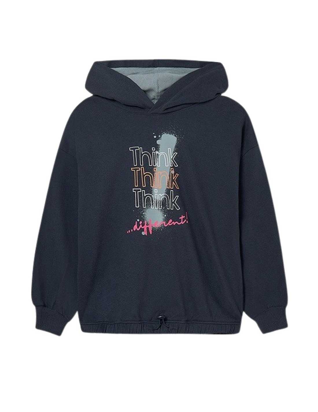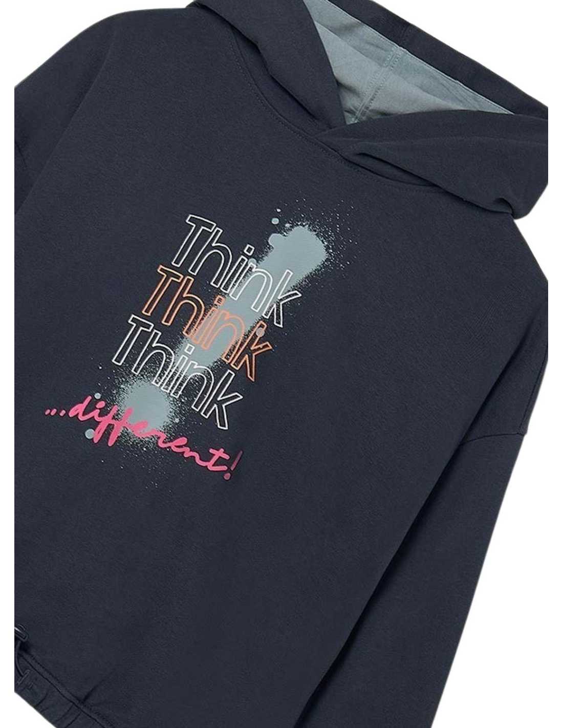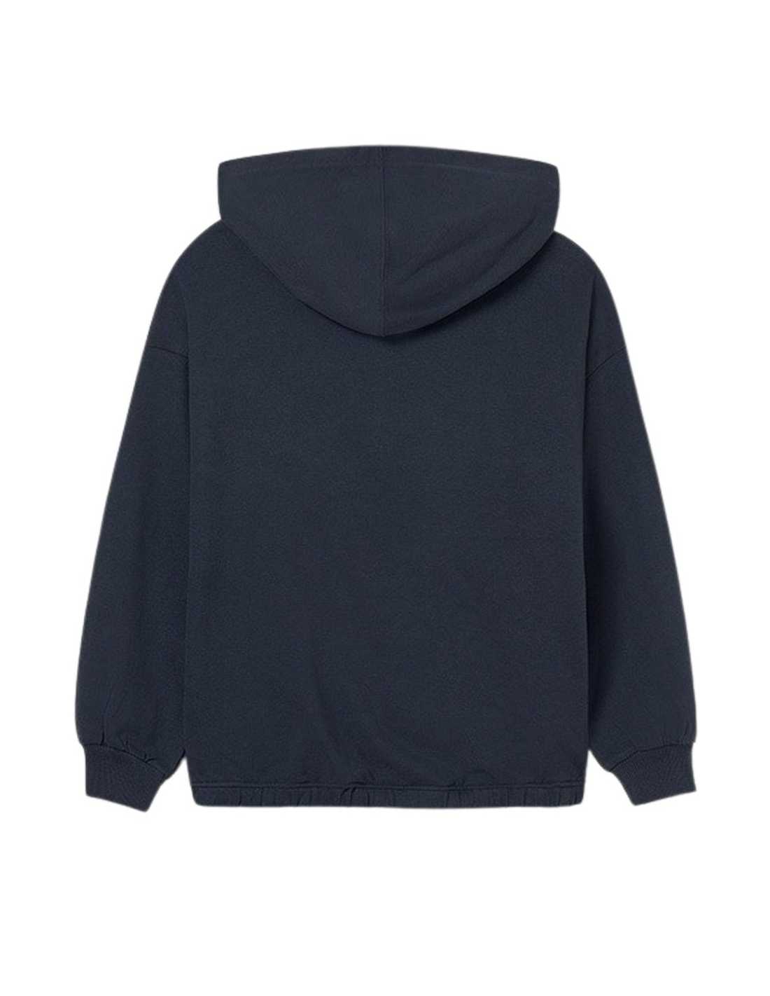 Sudadera de manga larga para chica. Cuello con capucha. Diseño de corte largo. Diseño con cordón regulable en el bajo para un mejor ajuste al cuerpo. Elementos de adorno: serigrafía (print). Se trata de un artículo de diseño unisex de gran versatilidad por la neutralidad de sus tonos y su forma.
